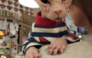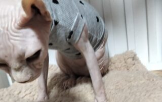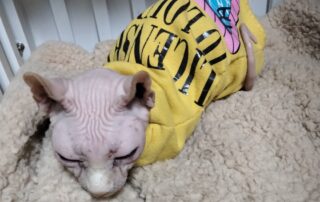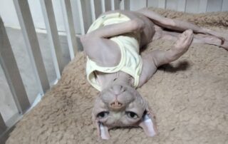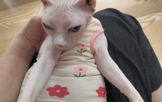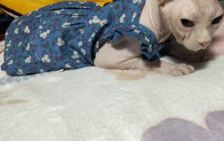 如今,这只无毛猫已经彻底变了模样,胖得像头小猪,连无毛猫最大号的衣服都穿不下了,肚腩超级大,走起路来一摇一摆,憨态可掬。她性格非常粘人,喜欢主动跳到客人腿上撒娇,还会热辣滚烫地贴过来亲近你,让人无法抗拒。她的到来不仅为我们的生活增添了乐趣,也让我更加坚信,每一只流浪猫都值得被温柔以待。